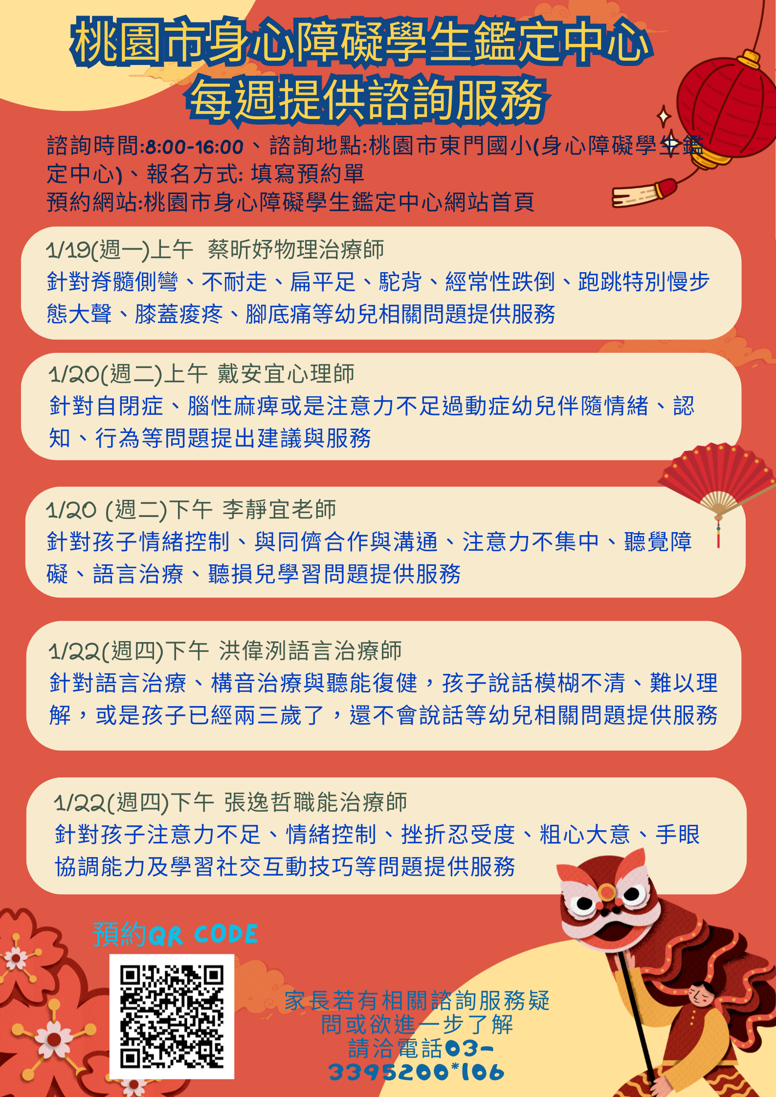若您正苦惱孩子出現脊髓側彎、駝背、跑跳特別慢、步態大聲、 膝蓋痠疼、腳底痛等問題。或說話模糊不清、難以理解或是孩子已經兩歲了、三歲了還不大會說話或其他發展遲緩等問題。????桃園市身心障礙學生鑑定中心針對上述狀況可以回電給老師及家長諮詢建議,歡迎預約電話或現場諮詢????預約網址: https://reurl.cc/5DXbz6