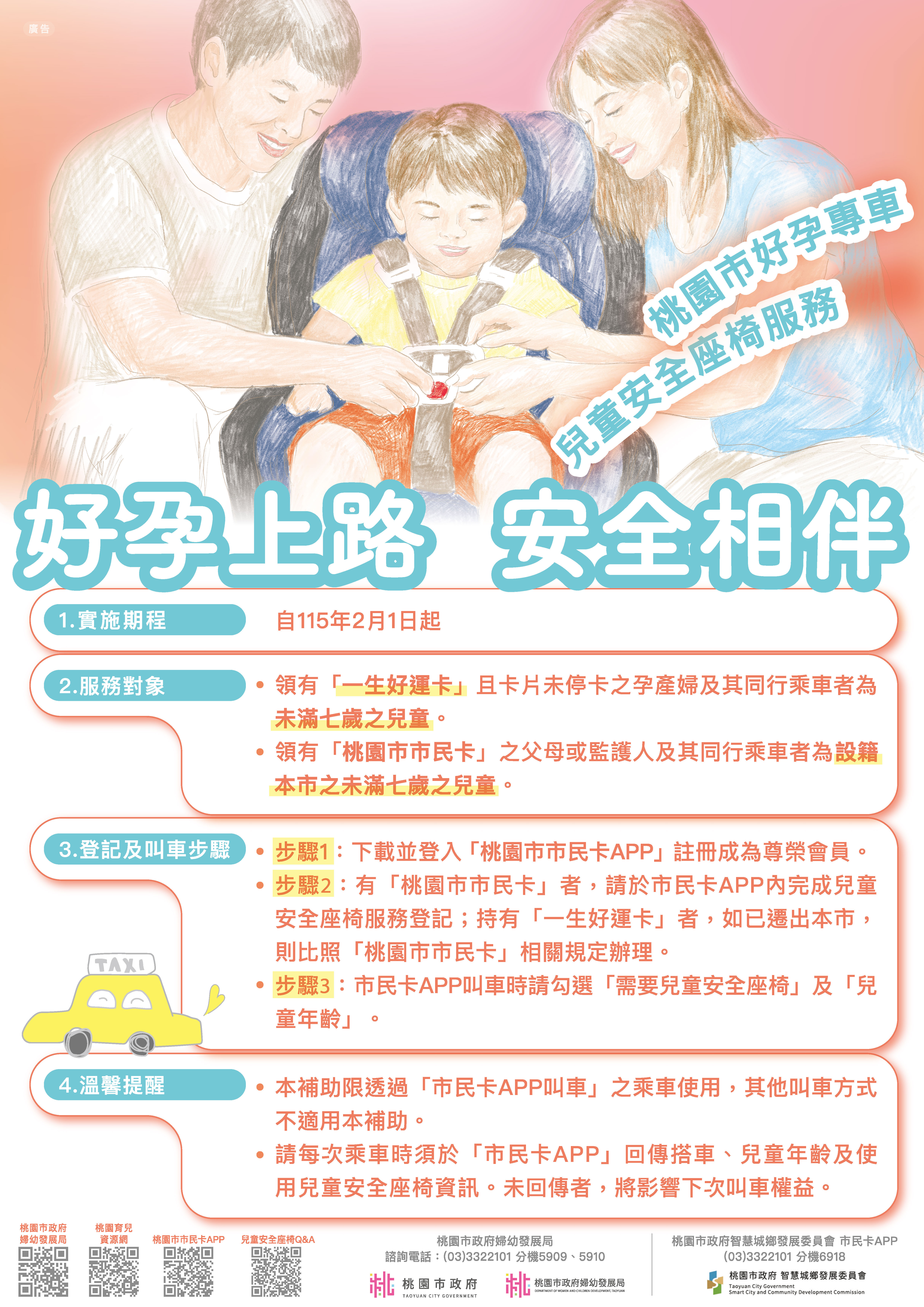 為提升孕產婦交通便利與生養支持,本市推動「好孕專車」服務,自115年1月1日起,車資補助使用效期由產後7個月延長至產後1年,並同步推動市民卡APP整合叫車服務及「一生好運卡」婦幼友善商家專屬優惠,提供孕產婦更友善之交通服務與生活支持。另為保障0至6歲兒童乘車安全,本市自115年2月1日起,率全國之先推出「好孕專車兒童安全座椅服務」,服務對象除「一生好運卡」持卡人外,並擴大至育有0至6歲幼童、父母為桃園市民且持有市民卡之家庭;民眾僅需透過市民卡App註冊成為尊榮會員,即可於市民卡APP完成綁定並使用整合叫車及安全座椅服務。